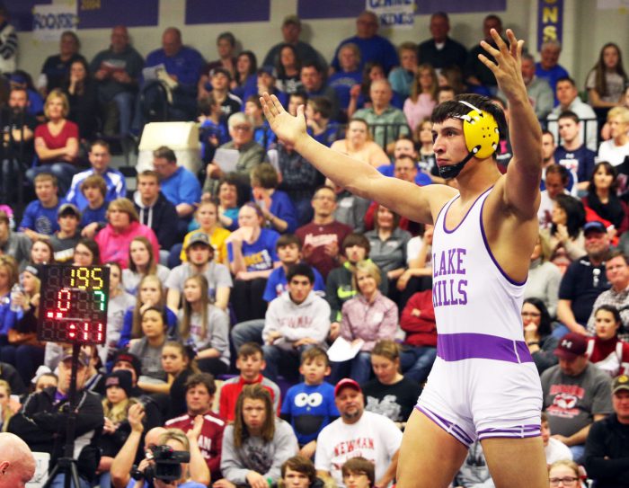 195 – Gabe Irons (Lake Mills) over Wyatt Sawvel (Don Bosco) Fall 5:08