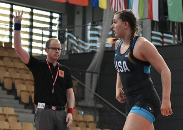 The only American win on the day came from four-time age-group World Team member Rachel Watters (Ankeny, Iowa/Aries WC), who defeated Aysegul Ozbege of Turkey with a dominant 10-0 technical fall to open her second World Championships of the year.