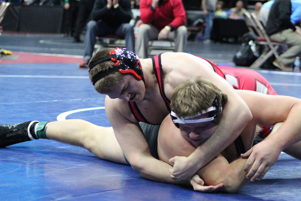 Liam Aunan won a wrestle back against Mitchel Michowksi to make it to districts at 195 District 2.