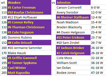 Now in the number one slot, Ferguson will look to defend his new ranking against another top opponent in #4 ranked Owen Helgeson. Ferguson looked great in his match against Carter Martinson of Southeast Polk. This also happens to be the only top five head-to-head meeting in the dual, which makes it deserving of the top spot.