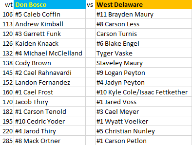 On top of the fact that we have a top ranked dual showdown these two teams were both at the Bobcat Jerry Eckenrod Invitational last weekend, a tournament that was won by West Delaware (Don Bosco was third behind Waukee).