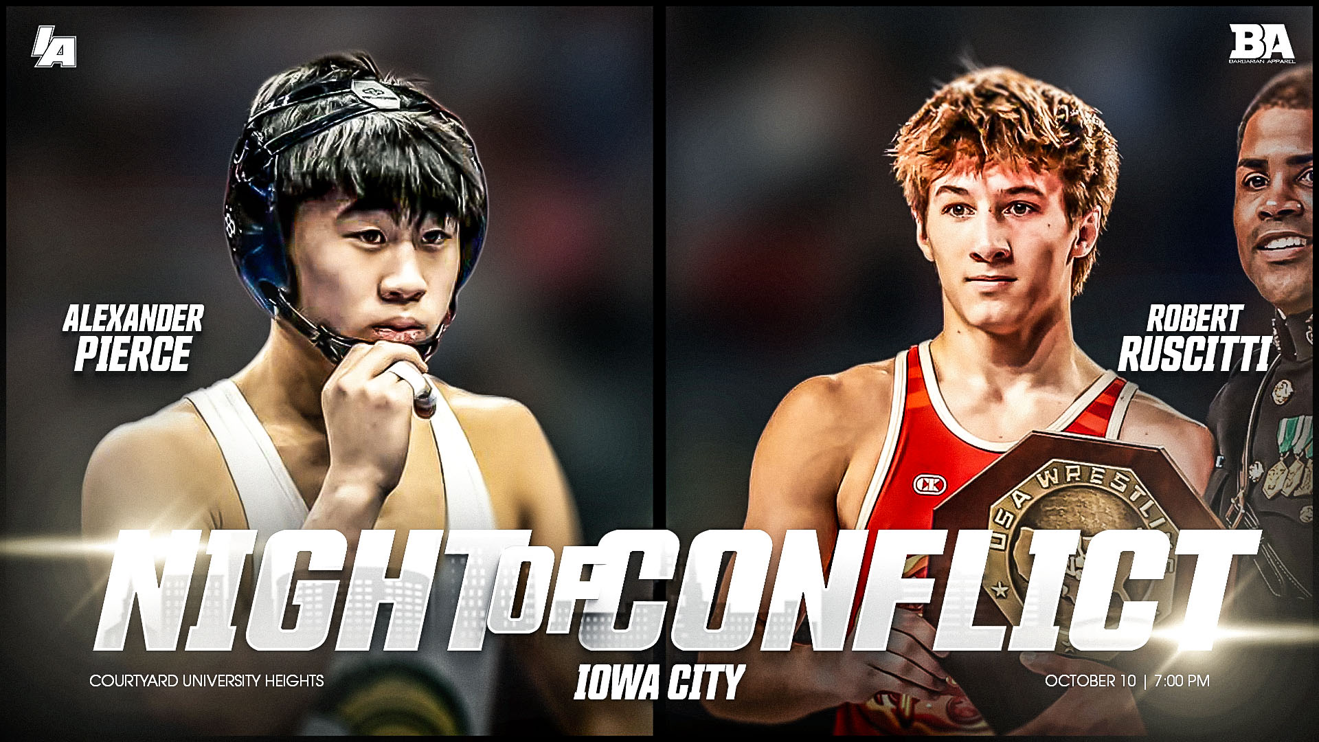 IAwrestle is proud to announce the return of Night of Conflict on Friday, October 10, 2025, in Iowa City. The preseason showcase will be held at the Courtyard Iowa City University Heights (901 Melrose Ave, Iowa City, IA 52246). Doors will open at 6:30 PM with wrestling set to begin at 7:00 PM.